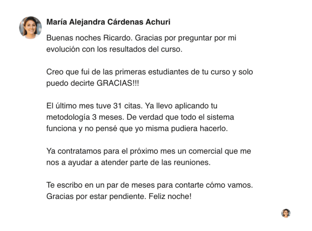 El resultado es un equipo más seguro, alineado y con mayor claridad comercial, y una empresa que gana visibilidad ante decisores, posiciona a sus voceros con autoridad y desarrolla un canal comercial orgánico y medible que no depende solo de la pauta.