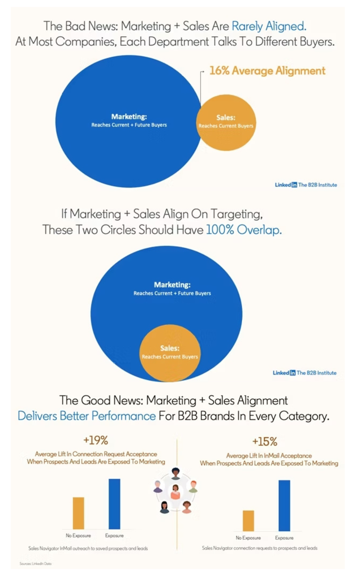 En la infografía vemos un dato que debería preocupar a cualquier empresa B2B: solo el 16 % del alcance de marketing y ventas coincide, según un estudio global de LinkedIn. Es decir, la mayoría de las empresas no están hablando con los mismos compradores desde ambos frentes.